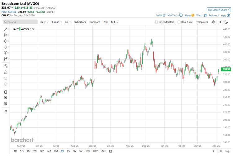 Although not immediately, Broadcom shares saw a positive reaction following the Apr. 2, CFO transition announcement, with the stock closing higher by 6.2% on Apr. 7, following a combination of the news and a new long-term AI deal with Alphabet (GOOGL). While the initial announcement on Apr. 2 showed minor movement, investor sentiment solidified on Apr. 7 as the company confirmed a 2031 AI chip deal on Apr. 6, driving the stock higher.