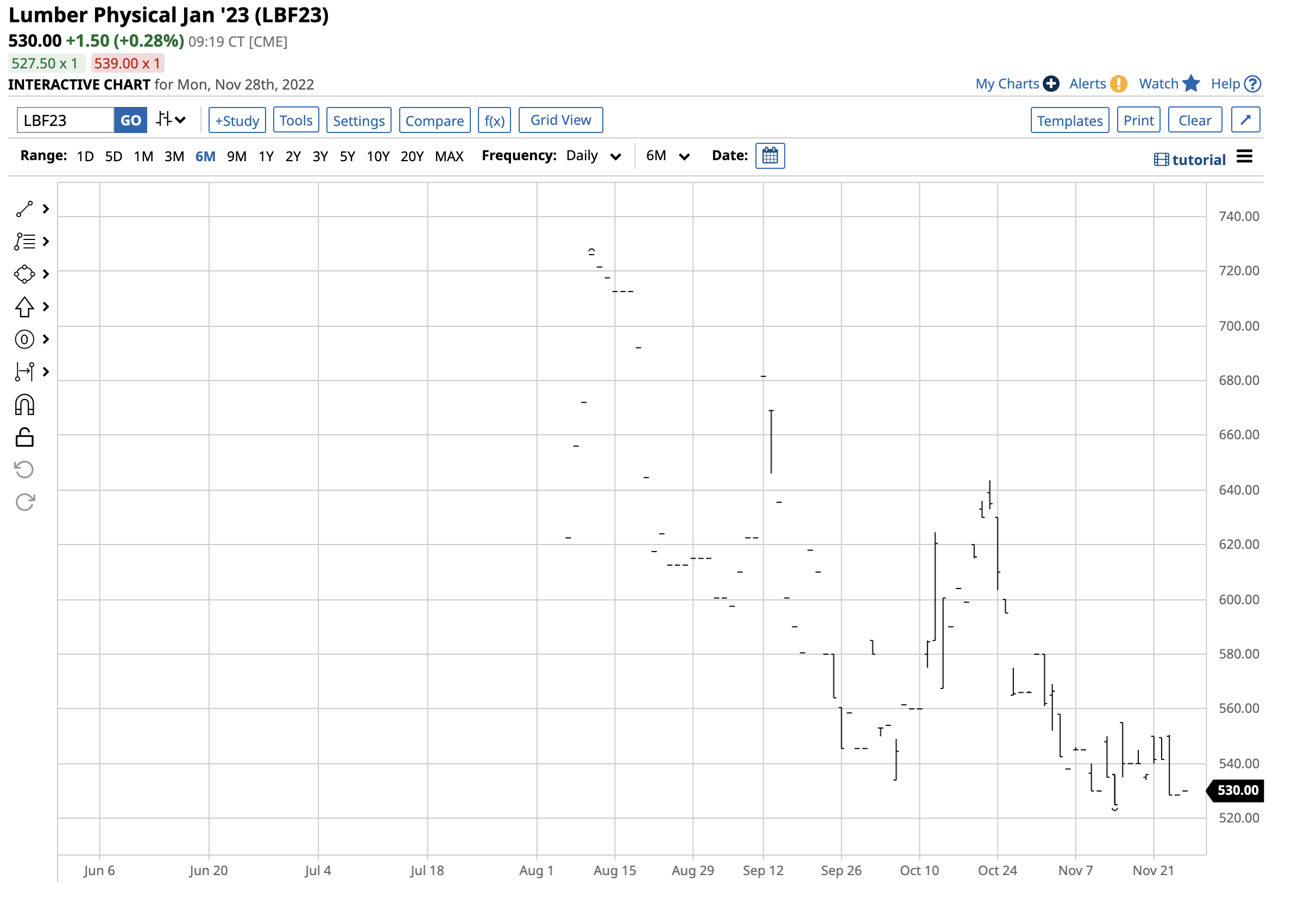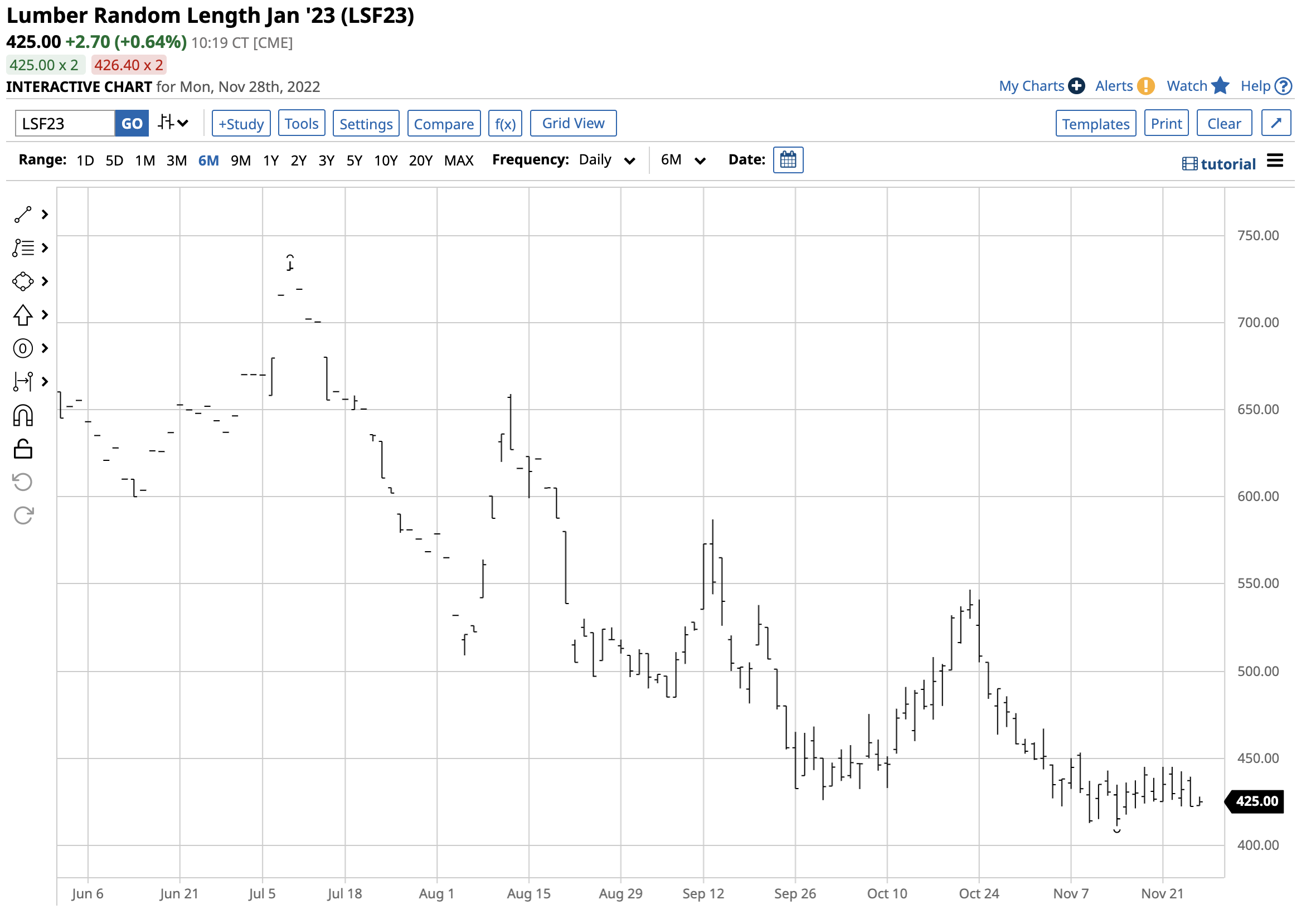 Since reaching a record high in May 2021 and making a lower peak in March 2022, lumber futures have been in a bear market. Three factors continue to weigh on wood’s price at the $425 level on November 28: