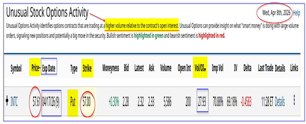 The puts trading today in huge volume are at the $57.00 strike price for expiry on April 17, 9 days from now. This volume is almost 28 times the prior number of puts outstanding at $57.00, likely from institutional investors.