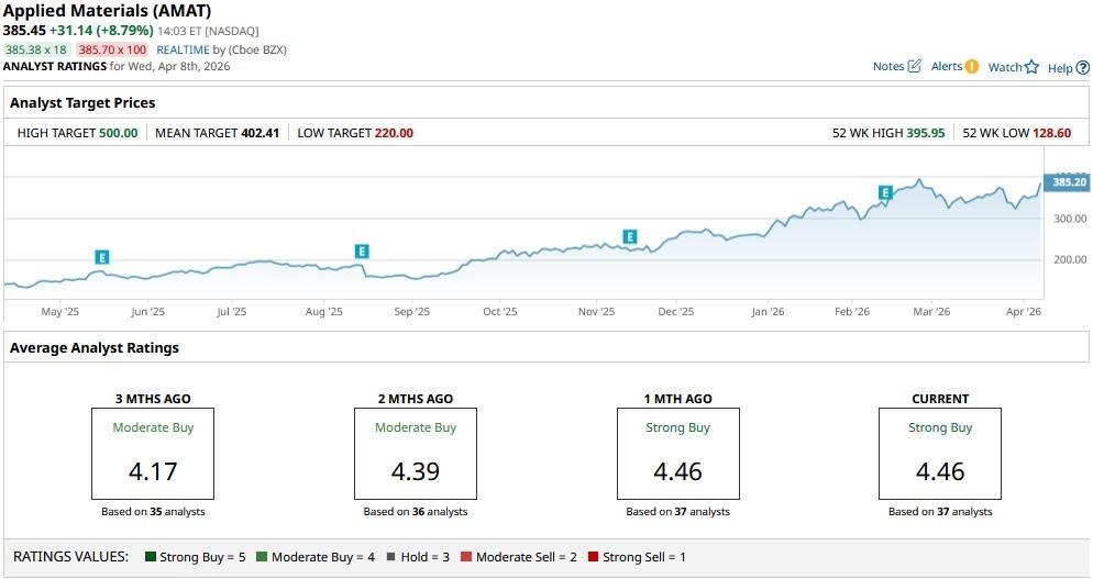 According to Barchart, the consensus rating on Applied Materials is a “Strong Buy” currently, with price targets going as high as $500, indicating potential upside of another 27% over the next 12 months.