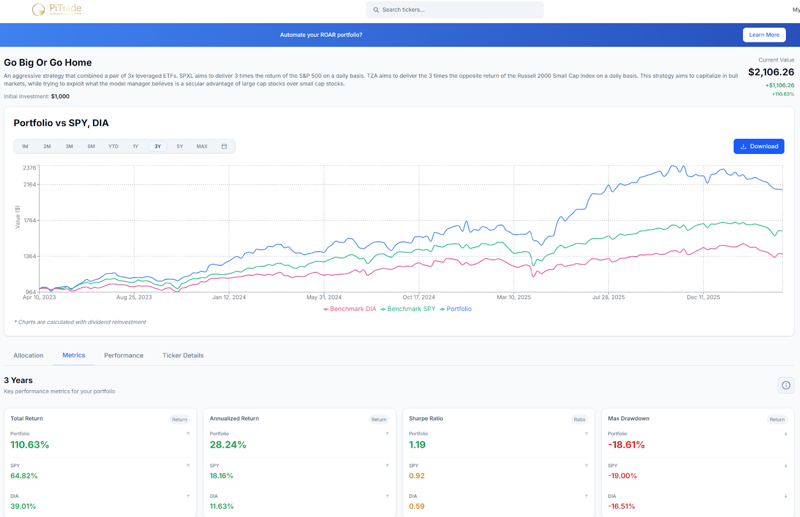 This is a portfolio I refer to as “Go Big Or Go Home.” You can consider this an actual portfolio, since it is available as a plug-and-play. But I’m highlighting it here more for the STRUCTURE. In other words, while I combined just two ETFs and a cash position, the same concept can be attempted and managed actively using any pair of ETFs.