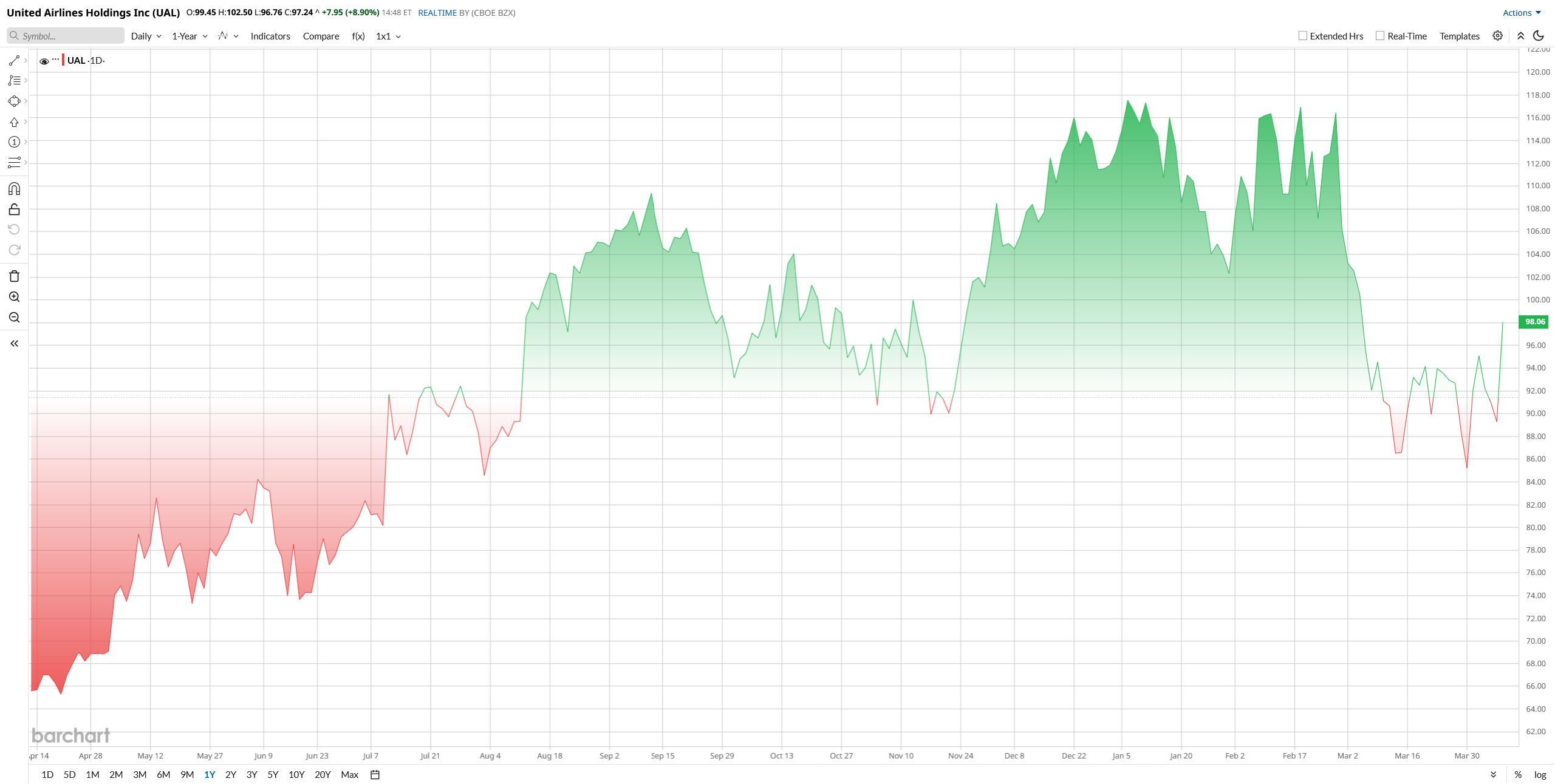 United’s stock has pulled back from early-2026 highs. After trading near $118 in January, UAL slipped into the $85 to $95 range by late March amid fuel and cost worries. Year-to-date (YTD), the stock is 12% down, yet 75% up over the past 52 weeks. The pullback can be linked to higher fuel and labor costs, plus more cautious guidance industry-wide. Overall, UAL’s 2026 drop tracks wider airline weakness even as demand holds up.