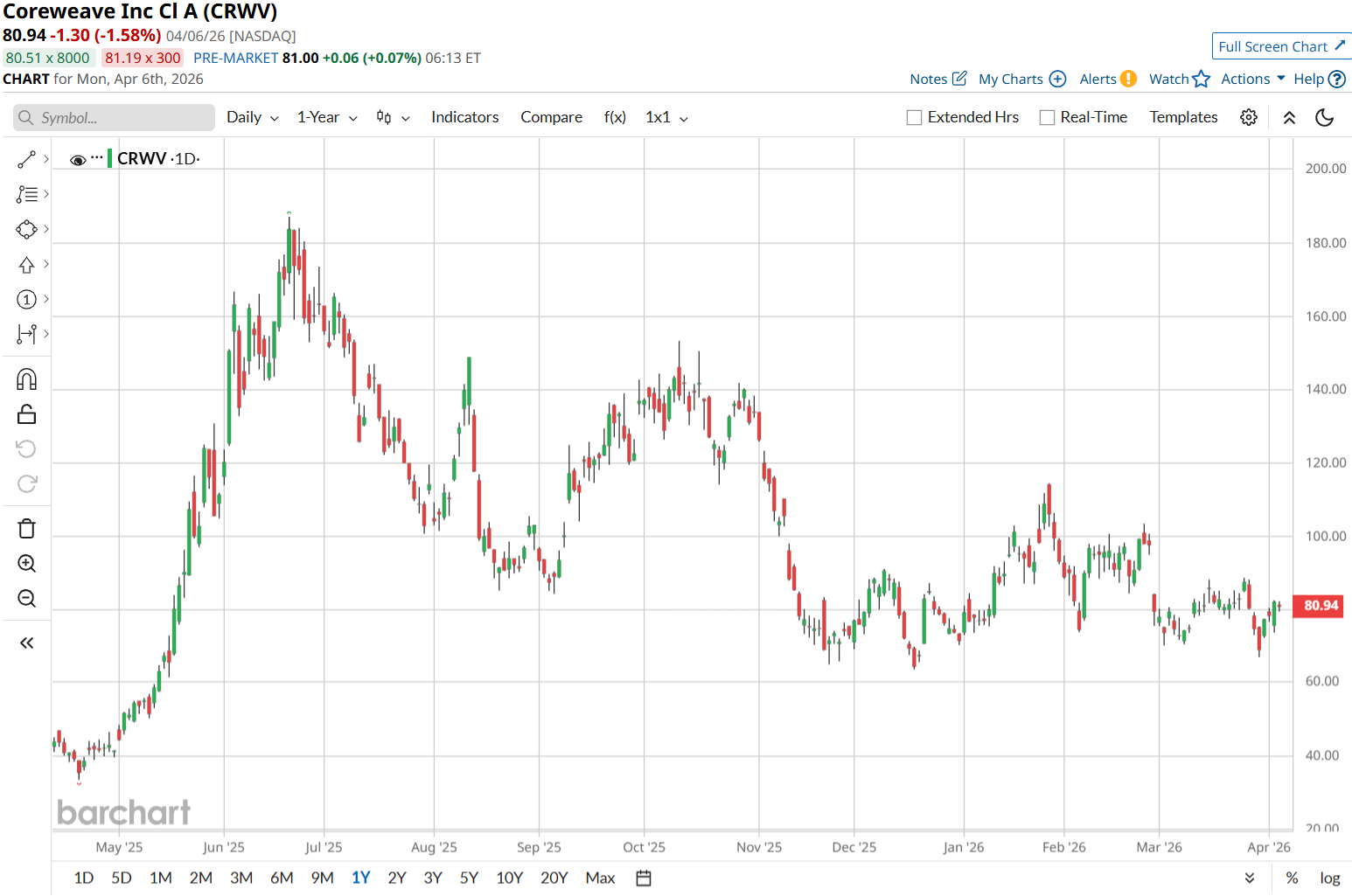 CRWV stock has held up well despite recent volatility. The stock is up 100% over the past 52 weeks and 23% year-to-date (YTD), showing that investors are still willing to pay for its growth story.