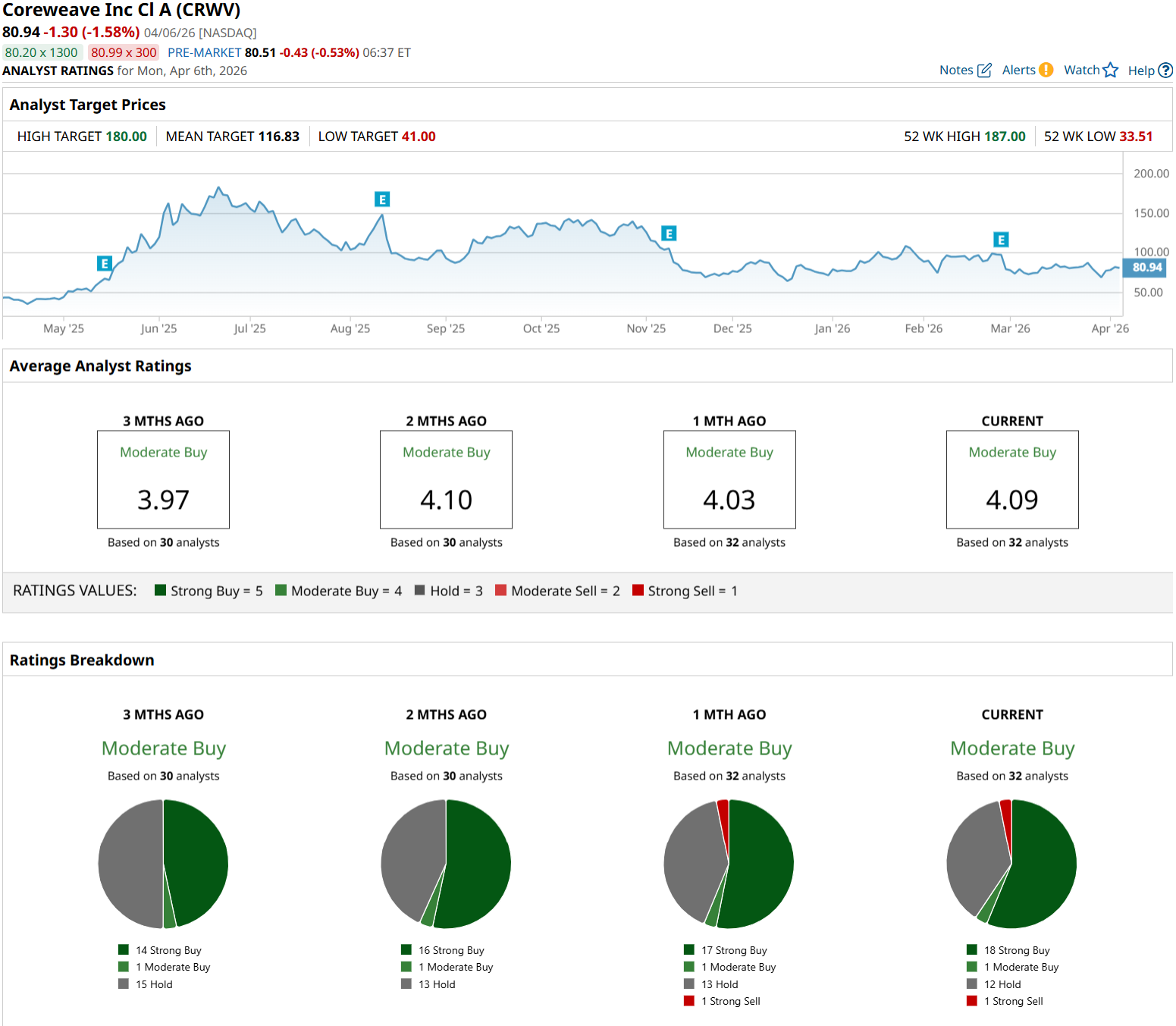 Broadly, Wall Street is leaning in the same direction. Based on 32 analysts covering CoreWeave, the stock has a consensus “Moderate Buy" rating. The average price target of $116.83 suggests roughly 31% potential upside from here.