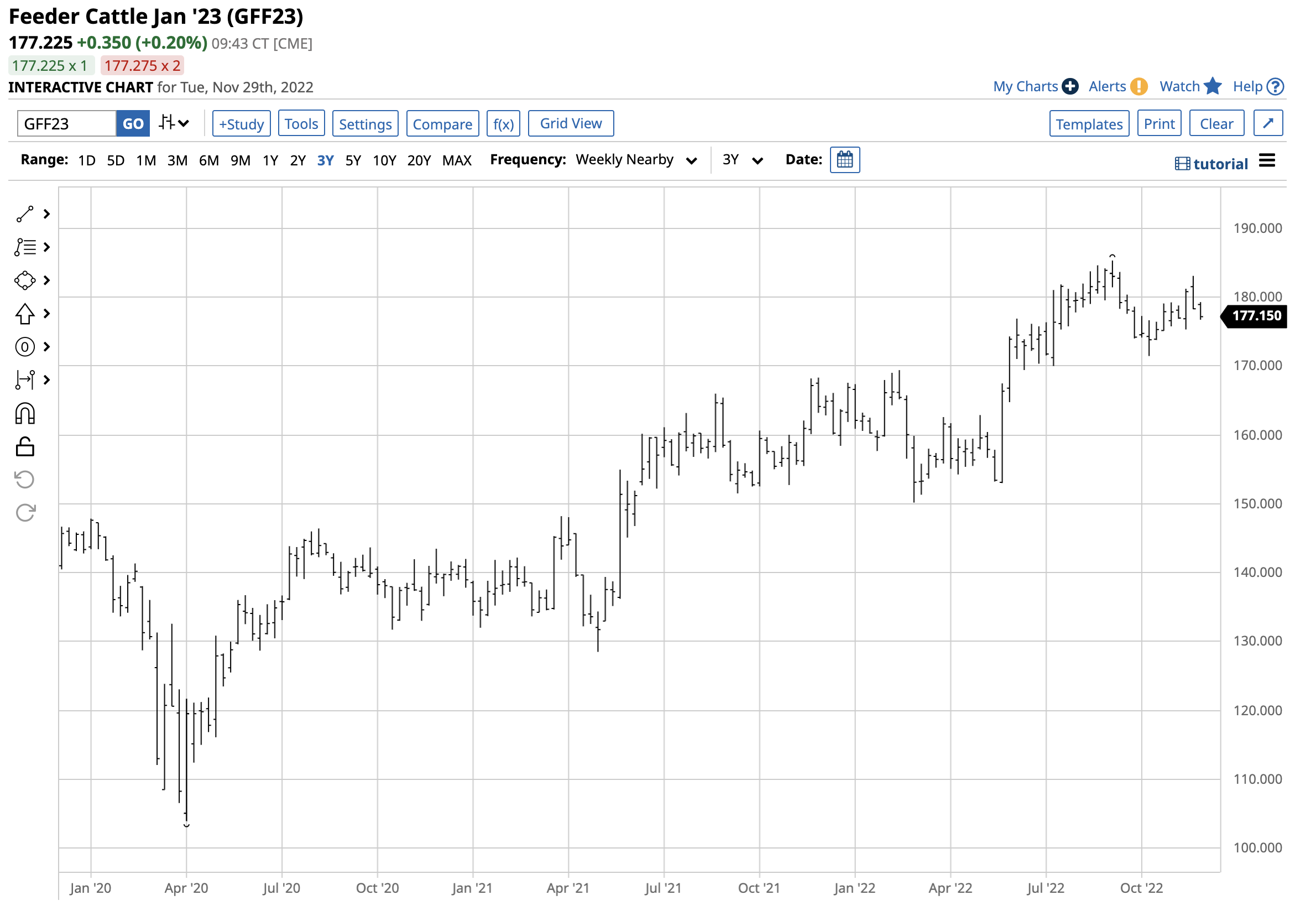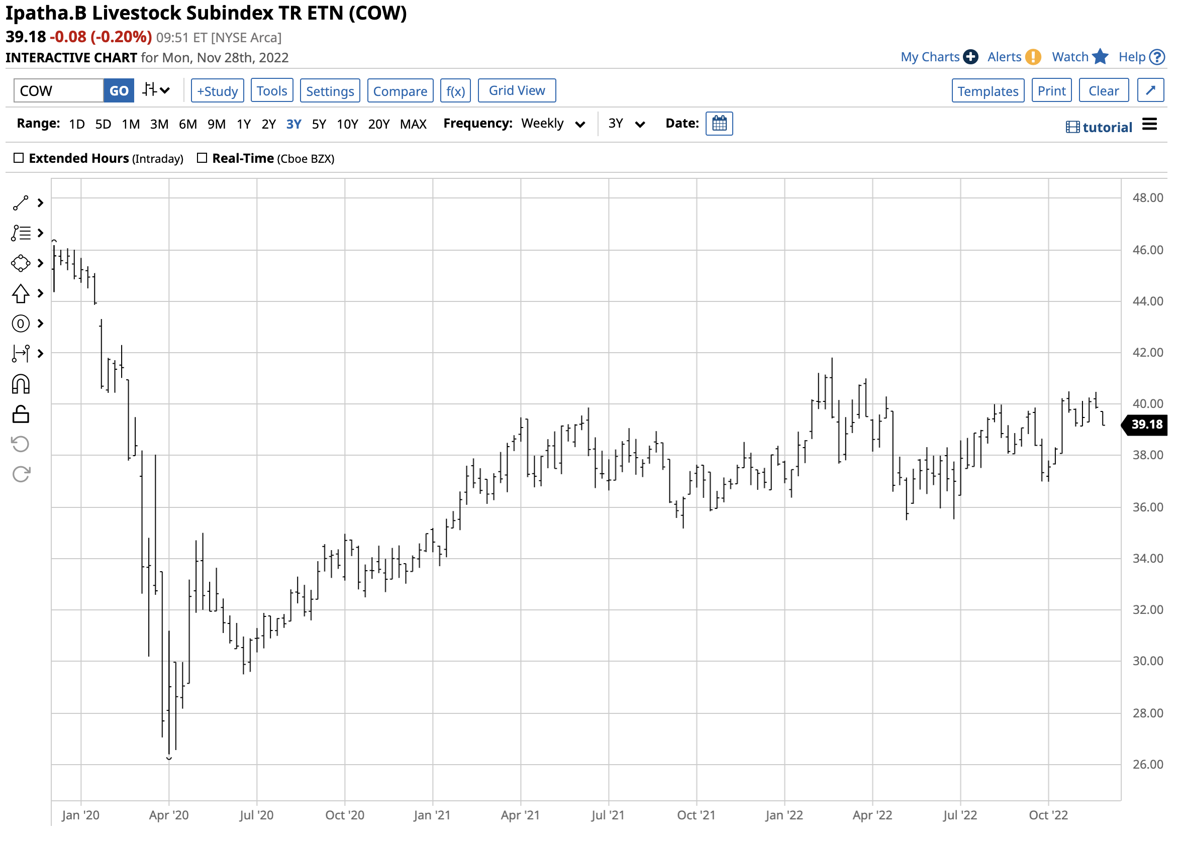 The chart shows COW rallied from $26.40 in April 2020 to a high of $41.81 per share in February 2022 as the futures markets began to reflect the 2022 grilling season prices. At $39.18 per share on November 29, COW remains a lot closer to the February 2022 high than the April 2020 low.Â