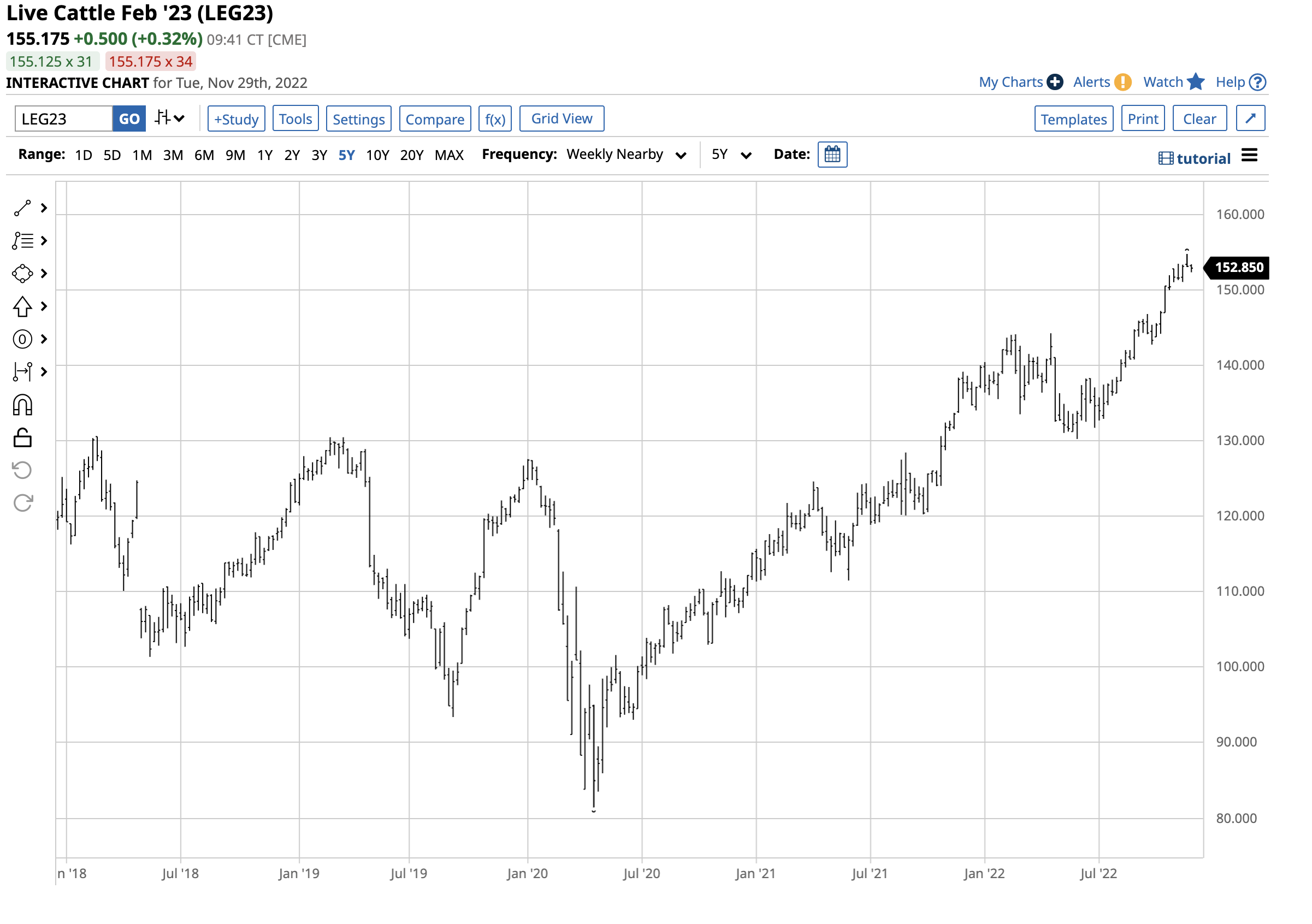 As the chart illustrates, the continuous live cattle futures contract has made higher lows and higher highs, reaching a peak of $1.54725 per pound in November 2022. At over $1.55 per pound on November 29, live cattle futures for February delivery were above the continuous contract high, the highest price since June 2015 at the beginning of the 2015 peak grilling season.Â