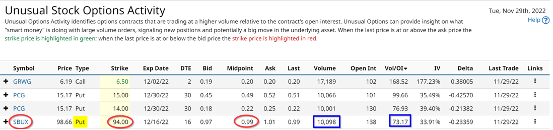 For example, the USOA Barchart report shows that some investor(s) bought 10,098 puts in SBUX at the $94.00 strike price. This is just 4.72% below today's price. However, the puts have a midpoint price of 99 cents, so SBUX stock has to fall to $93.01 (i.e., $94.00 strike price minus $0.99) or lower for the long-put investors to make any money.Â