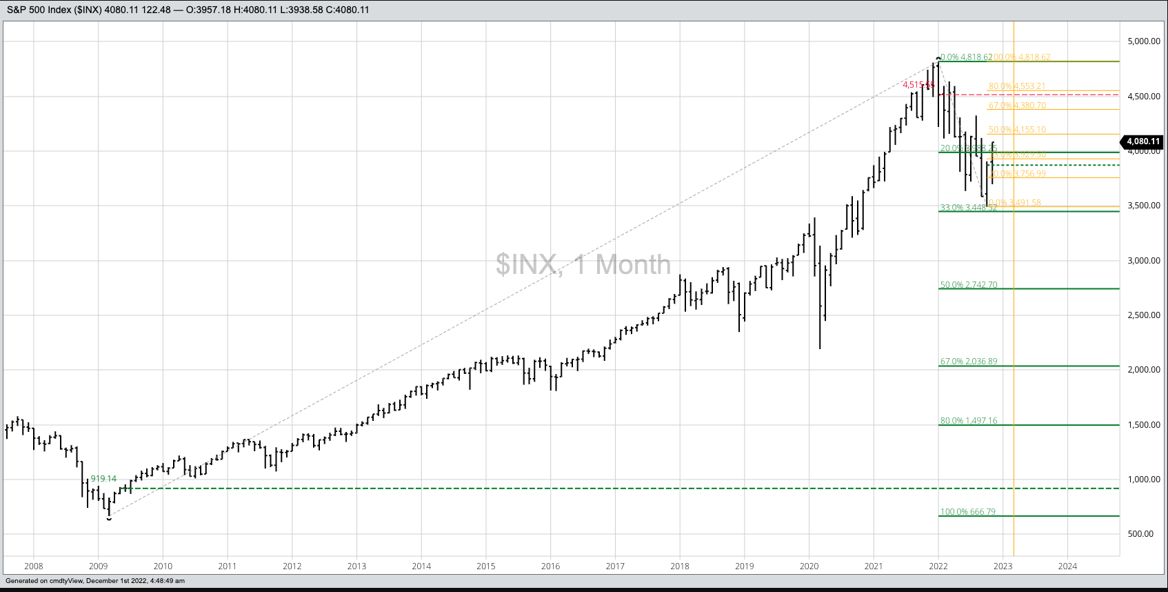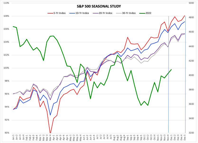 But where, and more importantly when? For this we turn to my seasonal study (based on weekly closes only) for the S&P 500 that shows the 2022 market (green line) compared to its 5-year (red line), 10-year (blue line), 20-year (purple line), and 30-year (gray line) indexes. It’s interesting to note all 4 of the seasonal time lengths show a bottom in late September, a pattern the 2022 market followed with its low in mid-October. What lies ahead, though? Each year about this time there gets to be more talk of a Santa Claus Rally in US stock markets. This study shows the S&P 500 tends to gain 2% from its last weekly close of November (last week) through the second weekly close of December (next week) before holding those gains through the end of the year. The first three days of this week has seen the $INX gain 1.3% from last Friday’s close of 4,026.12, with a 2% rally putting the target for next week’s close near 4,106.60. Note this would be in line with the 50% retracement mark of 4,155.10 on the monthly chart.