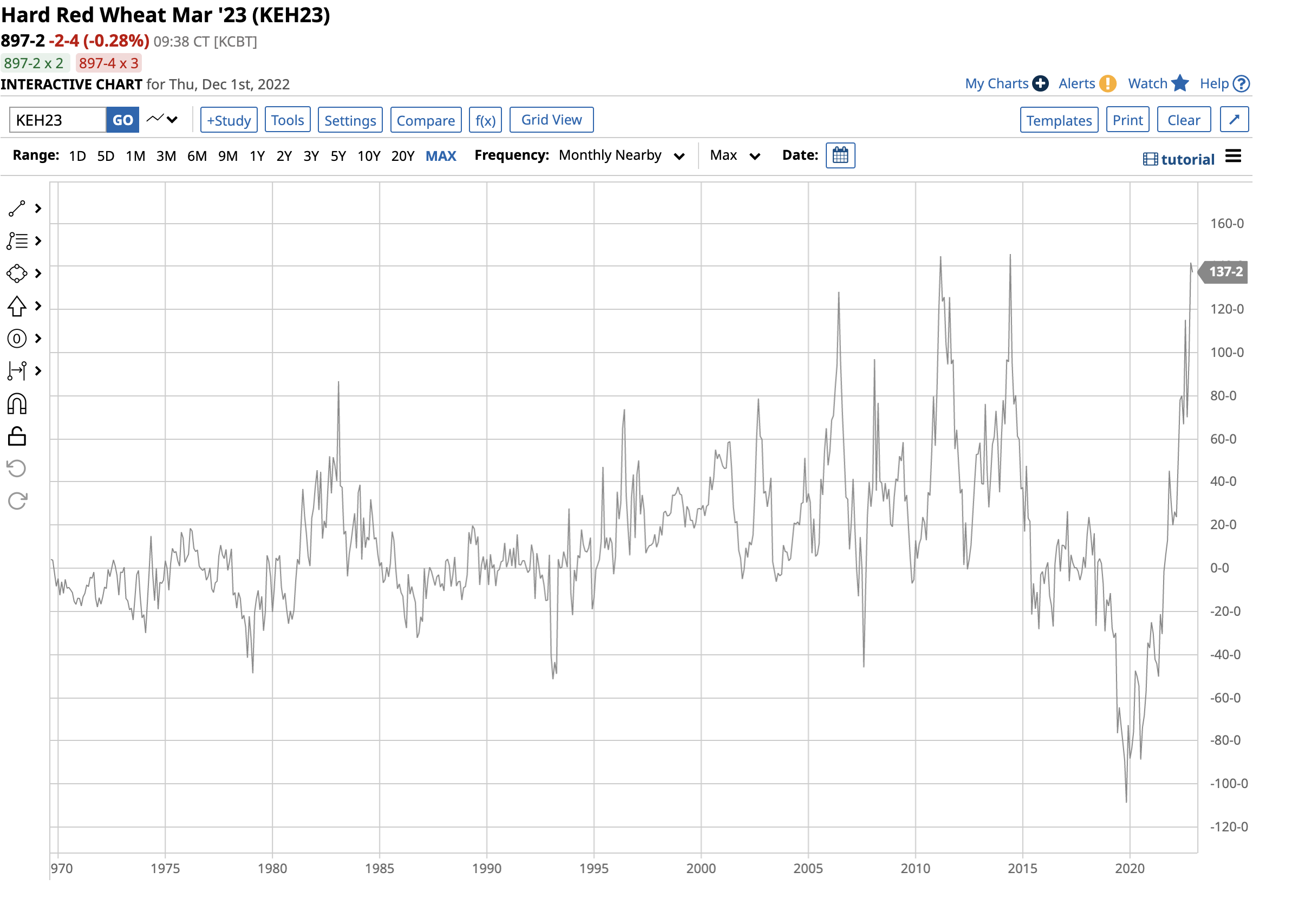 The chart shows the rally that took nearby CBOT wheat futures to $14.2525 per bushel in March 2022. Russia and Ukraine are leading world wheat-producing and exporting countries. The war caused significant supply concerns, but wheat futures have corrected to below the $8 per bushel level on December 1.Â
