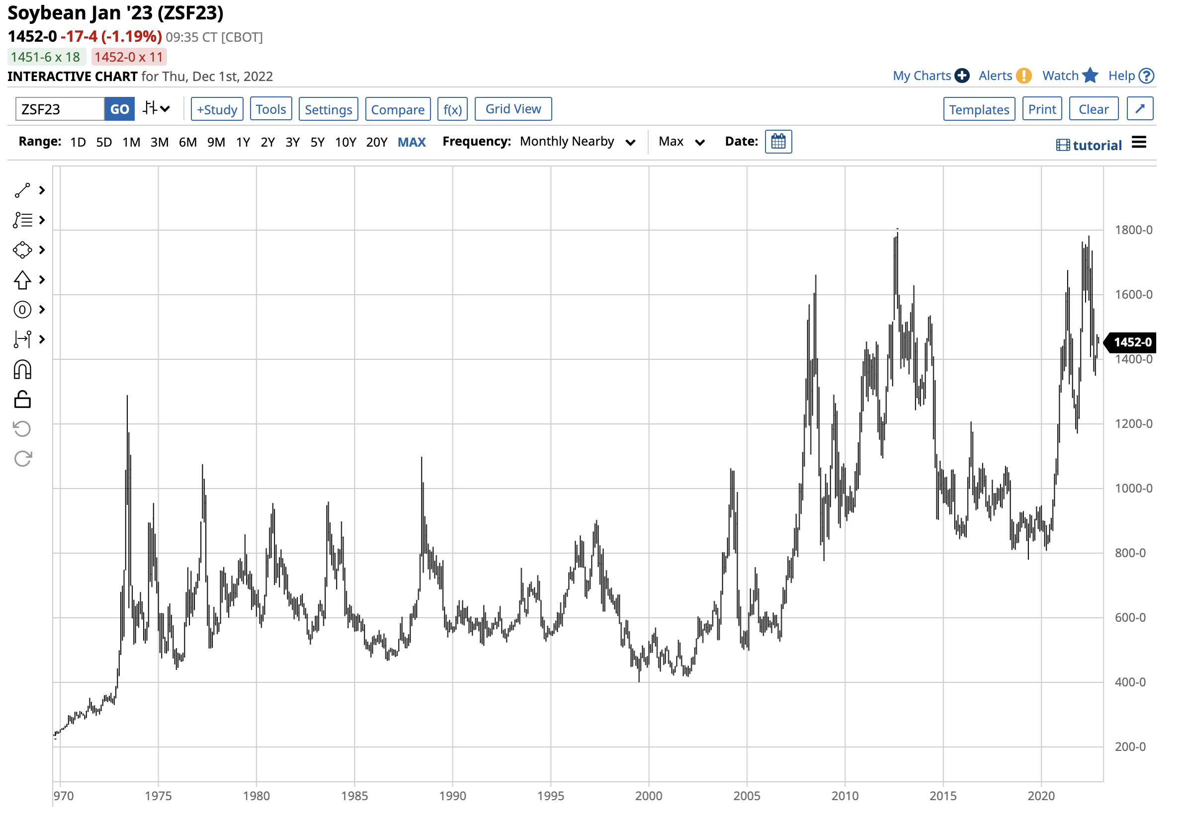 The chart shows that soybean futures reached an all-time peak of $17.9475 per bushel in September 2012, a drought-ridden year. In 2022, the war in Ukraine and raging inflation pushed the price to $17.84, just shy of the 2012 high, before correcting to the $14.52 level on December 1. Like corn, the beans remain at a multiyear high as we move toward the end of 2022.Â