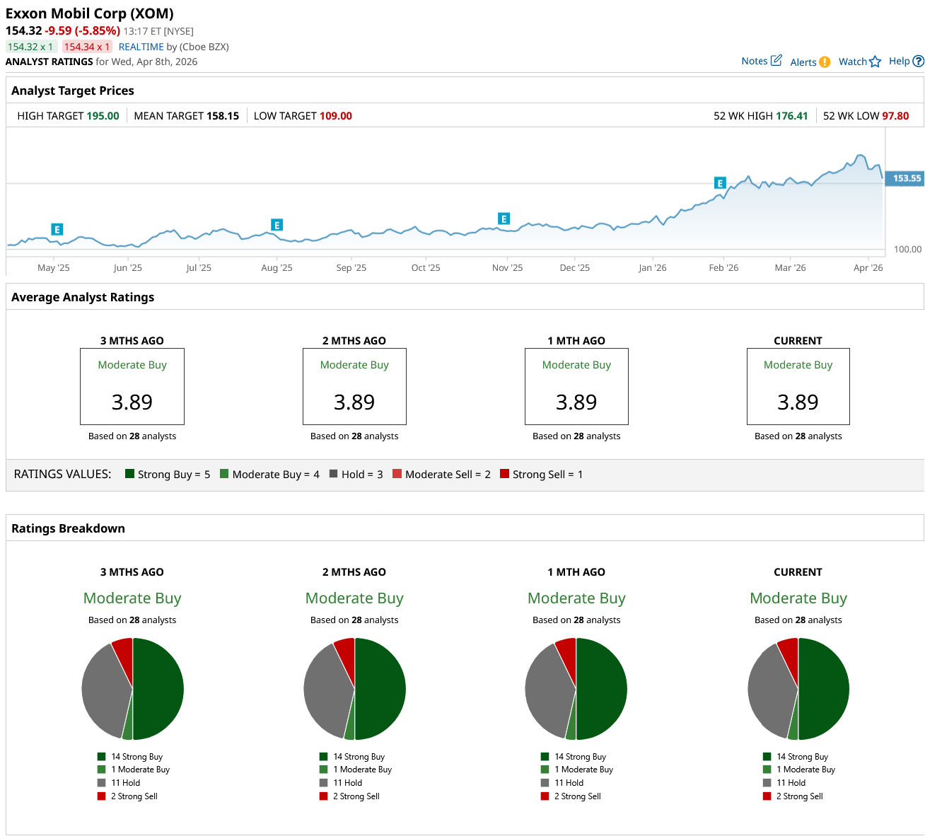 According to Barchart’s analyst ratings page, 28 analysts cover XOM and rate it a "Moderate Buy." There are 14 "Strong Buy" ratings, one "Moderate Buy," 11 "Hold" and two "Strong Sell" ratings.