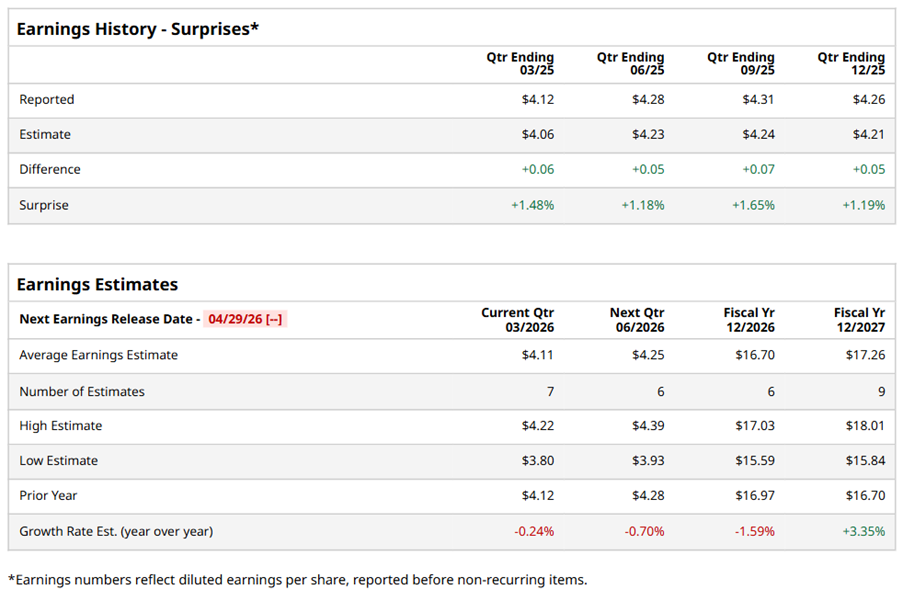 Glendale, California-based Public Storage (PSA) is a REIT that primarily acquires, develops, owns, and operates self-storage facilities. Valued at $50.9 billion by market cap, the company owned and/or operated 3,399 self-storage facilities located in 40 states with approximately 247 million net rentable square feet in the U.S. The self-storage giant is expected to announce its fiscal first-quarter earnings for 2026 in the near term.