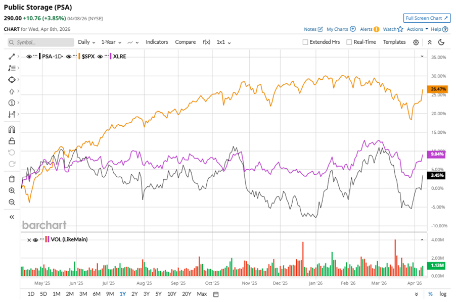 PSA stock has underperformed the S&P 500 Index’s ($SPX) 36.1% gains over the past 52 weeks, with shares up 8.9% during this period. Similarly, it underperformed the State Street Real Estate Select Sector SPDR ETF’s (XLRE) 14.5% uptick over the same time frame.