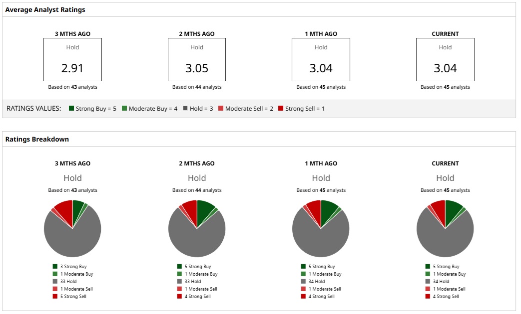 Based on 45 analysts with coverage, INTC stock has a consensus “Hold” rating. Five analysts have a “Strong Buy” rating for INTC stock, one analyst has a “Moderate Buy,” 34 analysts have a “Hold” rating, one analyst has a “Moderate Sell,” and four analysts have a “Strong Sell” rating.