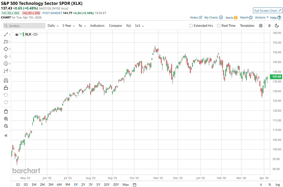 XLK’s latest figures show a price near $141.69, a year-to-date return of minus 1.58%, and a 52-week gain of 57.67%. It is very actively traded, with a recent weekly volume of 9,366,500 shares.