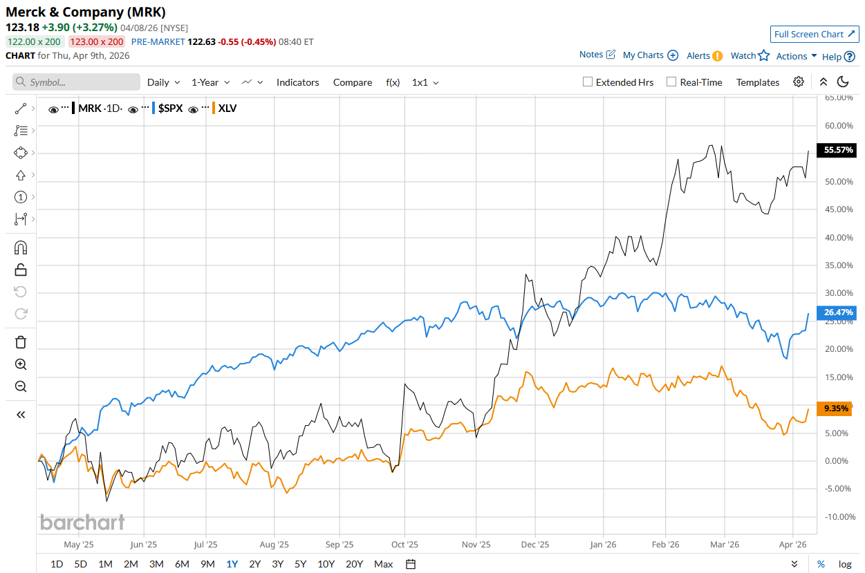 MRK stock has surged 49.8% over the past 52 weeks, outperforming the S&P 500 Index’s ($SPX) 36.1% rise and the State Street Healthcare Select Sector SPDR ETF’s (XLV) 12.6% rise during the same time frame.