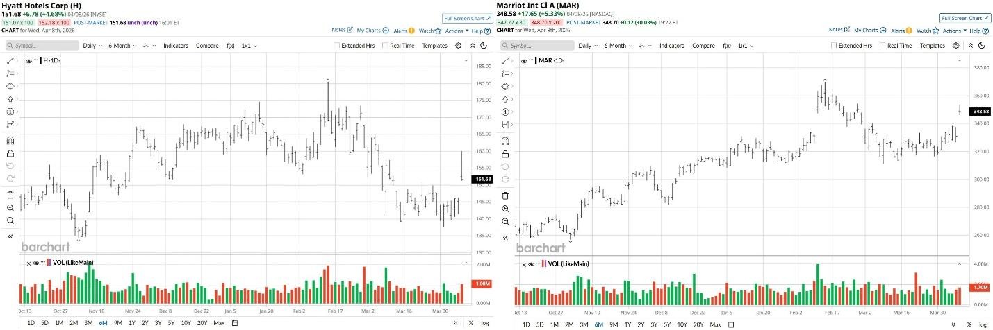Hyatt Hotels (H) and Marriott International (MAR) ended the session meaningfully higher on April 8 as a temporary ceasefire between the U.S. and Iran prompted a relief rally across travel and leisure stocks.