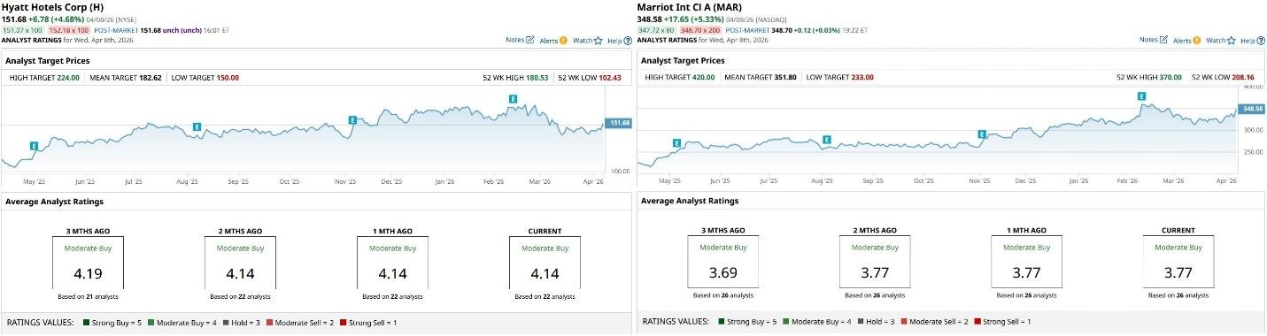 According to Barchart, the consensus rating on both is a “Moderate Buy,” with Street-high price targets signaling significant further upside in Hyatt and Marriott International.