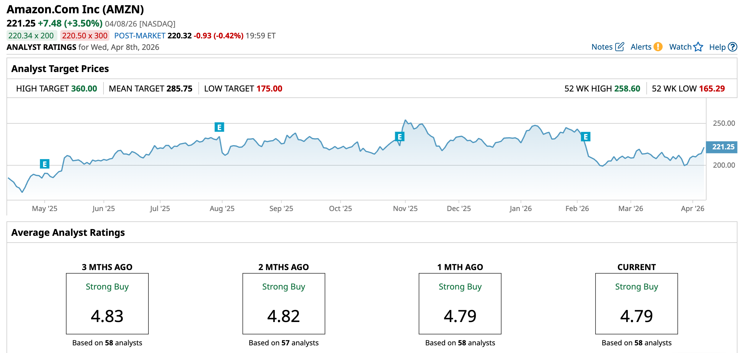 With Apr. 17 drawing closer and uncertainty still clouding the company’s near-term outlook, Wall Street’s conviction in Amazon remains firmly intact. The stock carries a “Strong Buy” consensus rating, reflecting broad optimism around its long-term growth story. Out of 58 analysts, an overwhelming 49 rate it a “Strong Buy,” with six issuing “Moderate Buy” and just three opting for “Hold,” a clear indication that bullish sentiment dominates the Street.