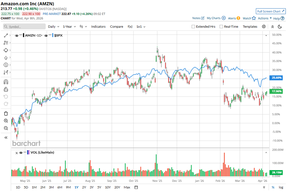 With a market capitalization of roughly $2.3 trillion, Amazon remains one of the most dominant forces in tech, but its stock has seen a choppy ride in 2026. Shares are down 4.15% year-to-date (YTD), broadly in line with the 0.92% decline in the S&P 500 Index ($SPX), reflecting a more cautious tone across the market. Zooming out, the longer-term picture looks steadier. Over the past year, Amazon has delivered a 29.64% gain, closely tracking the broader market’s 36.13% return.