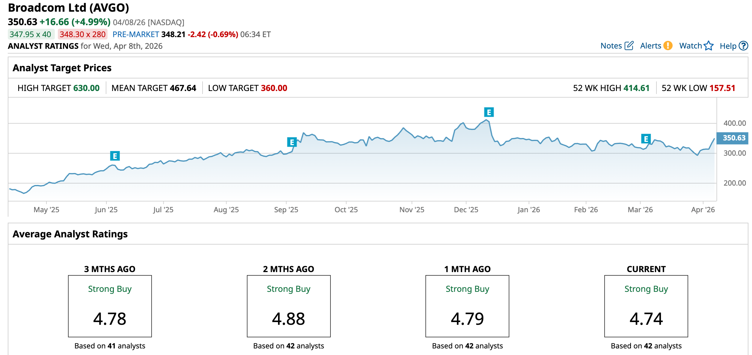 Wall Street analysts are strongly bullish on Broadcom’s stock, with a consensus “Strong Buy” rating. Of the 42 analysts rating the stock, a majority of 35 analysts have given it a “Strong Buy” rating, three analysts suggested “Moderate Buy,” while four analysts are playing it safe with a “Hold” rating. The consensus price target of $467.64 represents 33.4% upside from current levels. The Street-high price target of $630 represents an 79.7% potential upside.