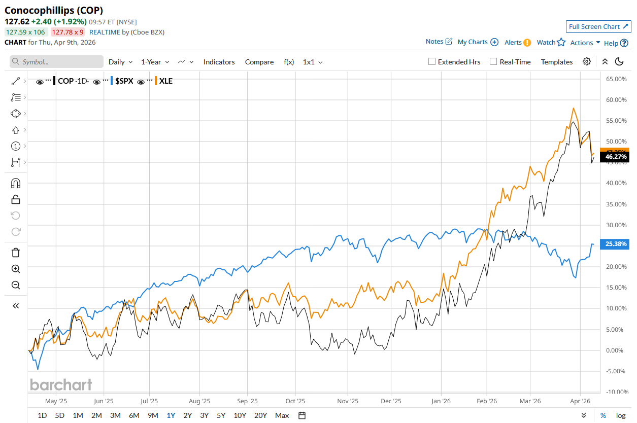 COP stock has surged 37.9% over the past 52 weeks, outperforming the S&P 500 Index’s ($SPX) 24.2% rise, but lagging behind the State Street Energy Select Sector SPDR ETF’s (XLE) 42.1% return during the same time frame.