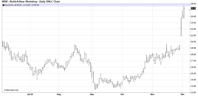 The Barchart Chart of the Day belongs to Build-A-Bear Workshop (BBW).  I found the stock by using Barchart.com to find the "Barchart New Highs" page, and then I clicked on pull-down to select stocks with new 52-week highs. I then viewed the stocks on the list with the FlipCharts feature.Â