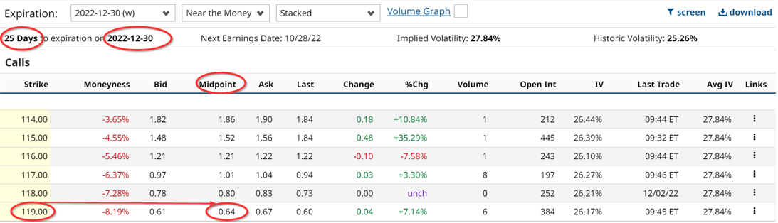 Right now some investors are playing out-of-the-money (OTM) covered calls and OTM short puts to generate extra income. For example, the Dec. 30, 2022, $119.00 strike price calls have a premium of 64 cents at the midpoint.