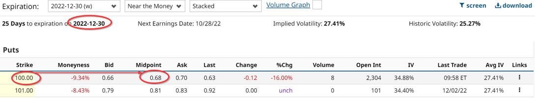 In addition, some investors are shorting OTM put options as well. For example, the $100.00 strike price for Dec. 30, trades for 68 cents.Â