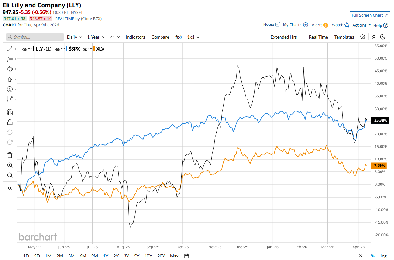 LLY stock has surged 25.5% over the past 52 weeks, outperforming the S&P 500 Index’s ($SPX) 24.1% rise and the State Street Healthcare Select Sector SPDR ETF’s (XLV) 7.2% rise during the same time frame.