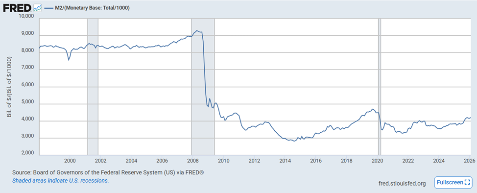The mechanism works like this: when the Fed takes a sharp “shot” of liquidity during a crisis, the monetary base (M0) soars momentarily. The aggregate M2 cannot soar synchronously because banking norms rigidly hold back this impulse. But here is the caveat: the colossal energy of this infusion does not disappear! It turns into accumulated potential. M2 begins to crawl upward with a delay, slowly but inevitably seeping into the system. The base expanded, and therefore the mass inevitably strives upward, pulling the entire economy up with it.