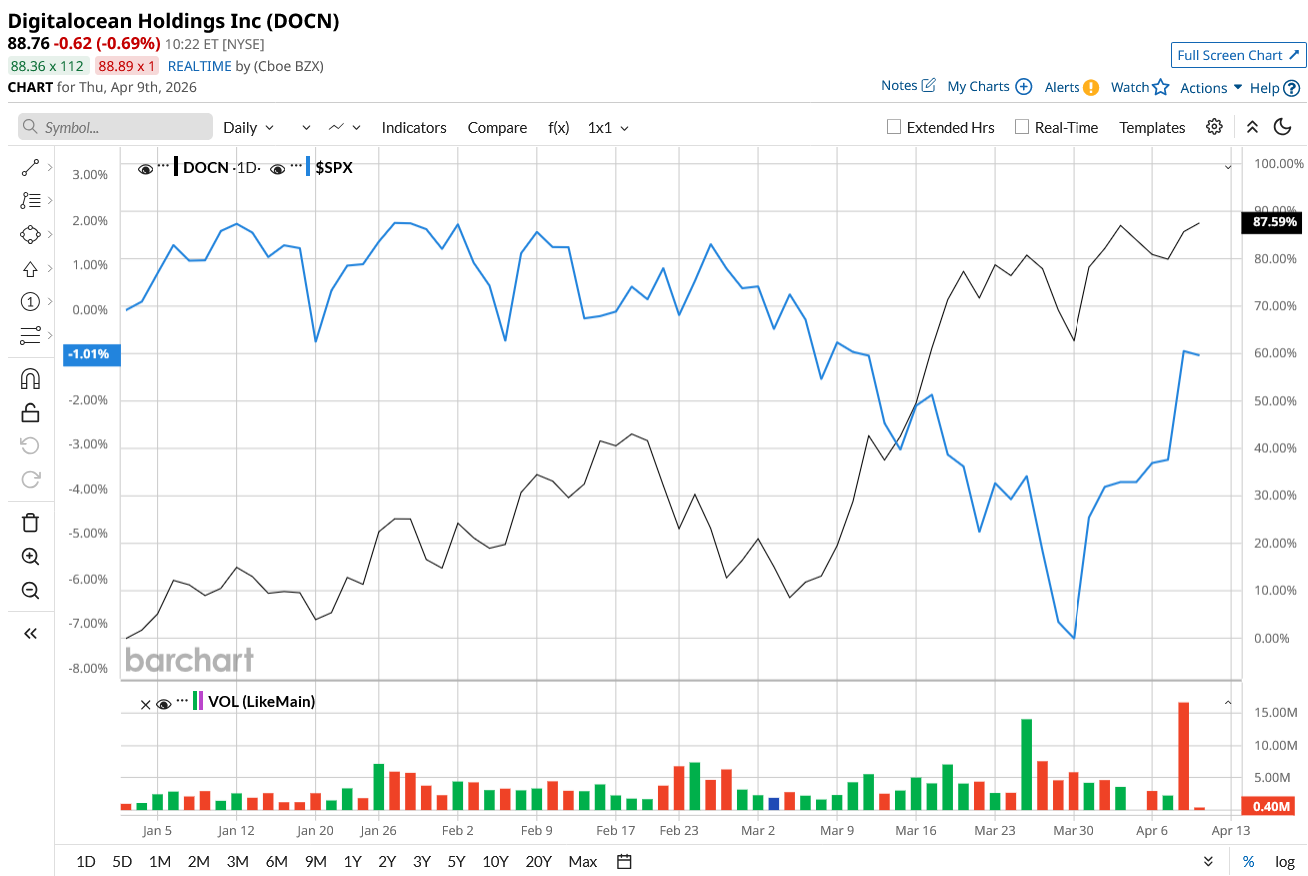 One such growth stock is DigitalOcean (DOCN), which is quietly transforming itself into a serious contender. And investors are starting to take notice. DOCN stock has outperformed all the big tech titans so far this year, climbing 194% over the last 52 weeks and 88% year-to-date (YTD), outperforming the broader market dip of 1%.