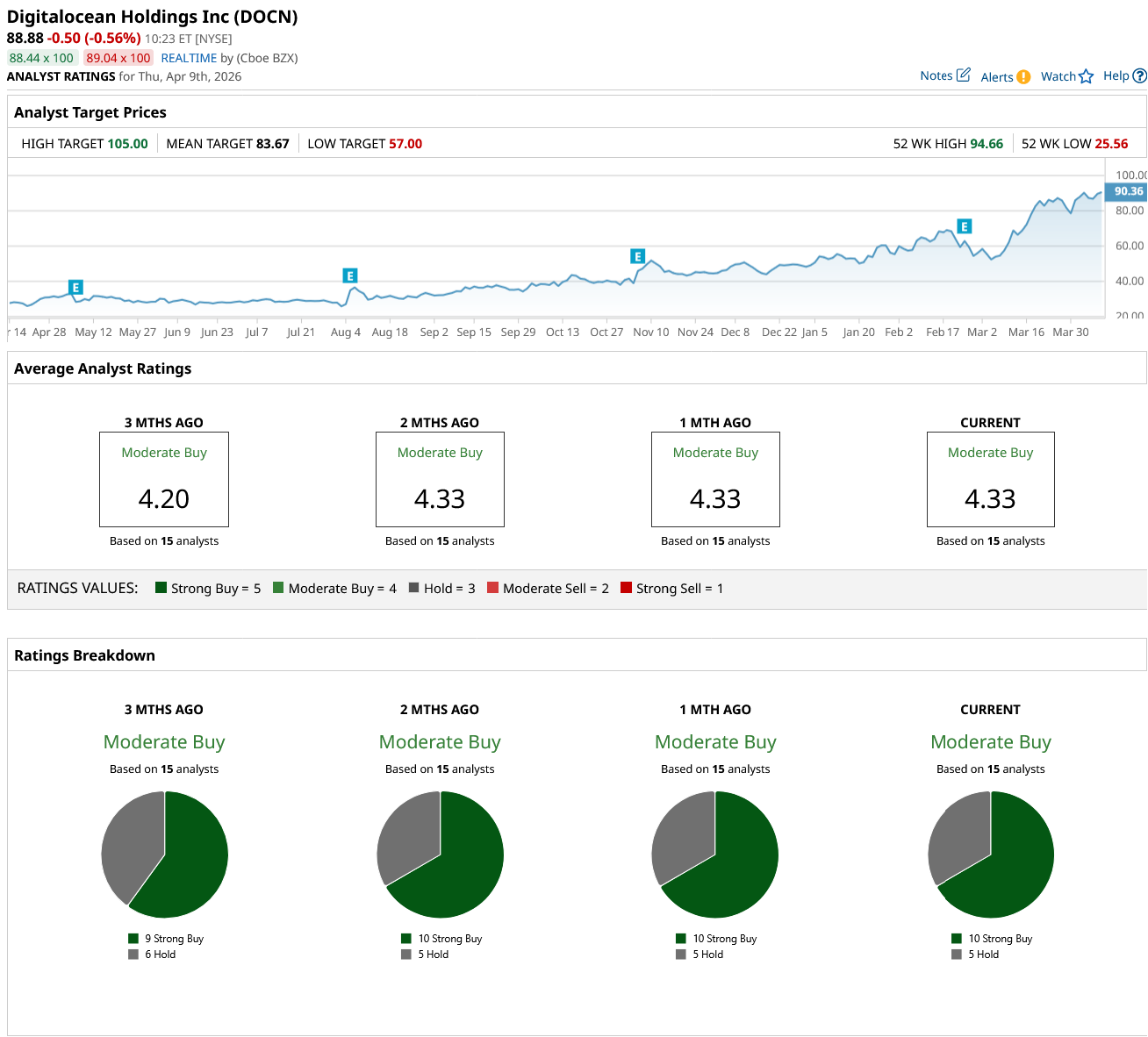 Wall Street sees DOCN stock as a “Moderate Buy.” Out of the 15 analysts covering DigitalOcean, 10 have a “Strong Buy” recommendation, and five suggest a “Hold.” DOCN stock is trading above its average analyst price target of $83.67. However, the Street-high price estimate of $105 implies a 25% potential upside over the next 12 months.