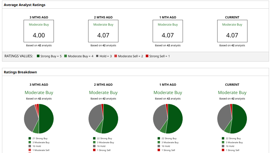 Most Wall Street analysts remain bullish on AAPL stock. The consensus among 42 analysts tracked by Barchart is “Moderate Buy.” Plus, the average price target is roughly $296, about a 14% upside from today’s levels.