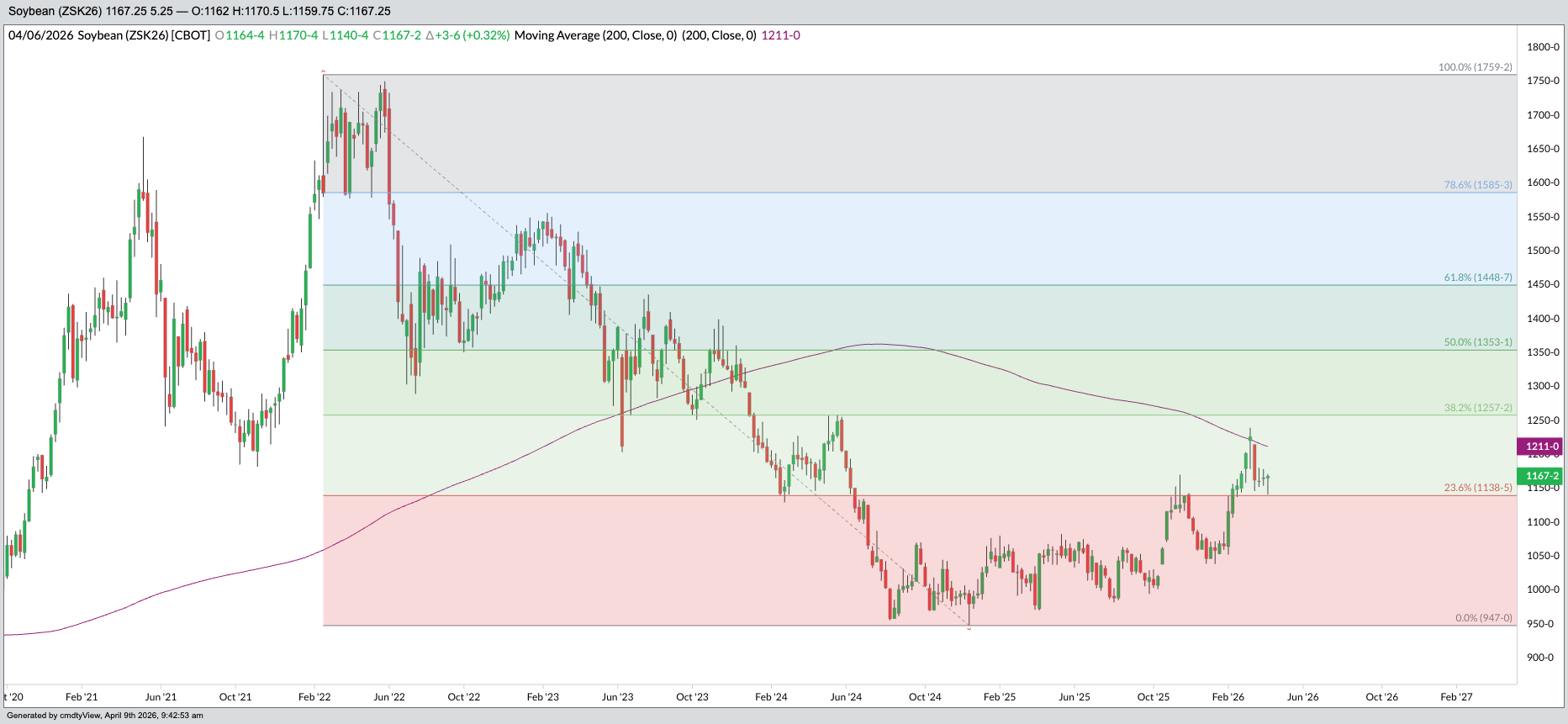 May Soybeans are fading support front he previous resistance and the 23.6% retracement from the 2022 high and the 2024 low.