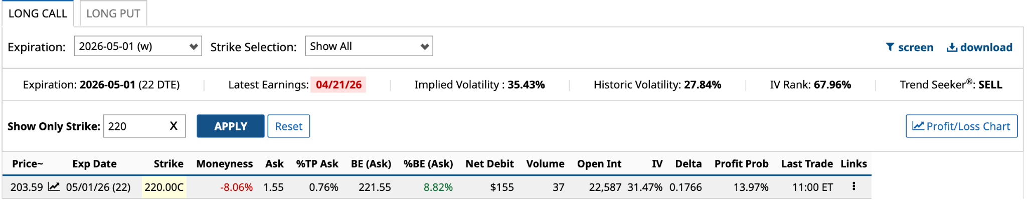 The information above is the latest trading information for the May 1 $220 call as I write this late Thursday morning. The ask price is higher at $1.55, but the share price is about the same as yesterday’s close. The call’s breakeven is about 8.82% above the current share price.