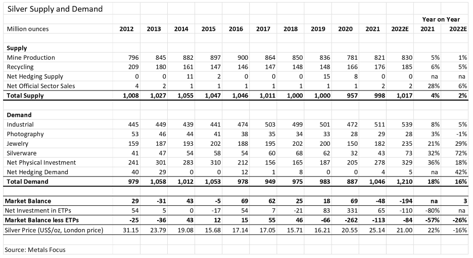The chart shows the increase in industrial and investment demand from 2020 to 2021, and the estimates are for even higher demand in 2022 from the industrial, jewelry, and silverware sectors.