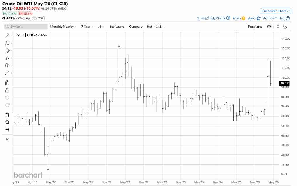 The chart shows that after trading below $60 per barrel in late 2025 and early 2026, NYMEX WTI crude oil futures rallied to over $94.50 per barrel on April 2, following a March 2026 explosive high of $119.48 per barrel.