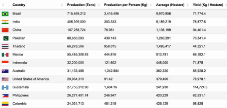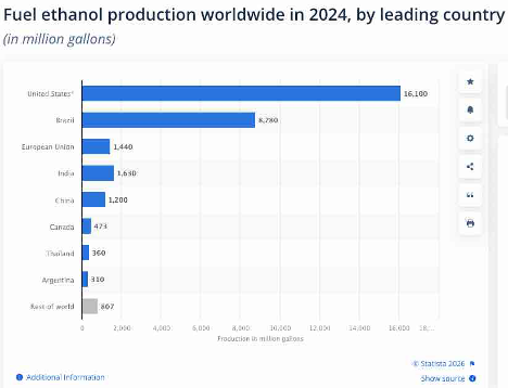 While Brazil and India lead in sugar production, Brazil is by far the leading producer. Sugarcane is the ingredient in Brazilian biofuel.