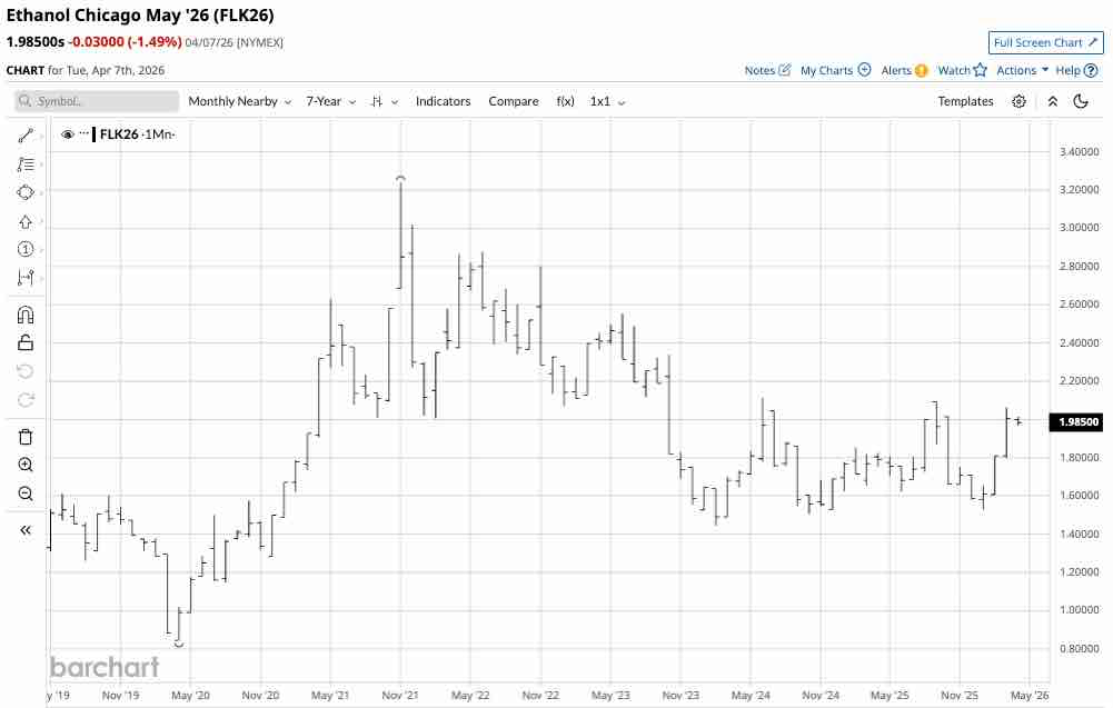 The monthly chart of Chicago ethanol swaps shows the rally from $1.53 per gallon in January 2026 to around $2 per gallon wholesale in March and April 2026.
