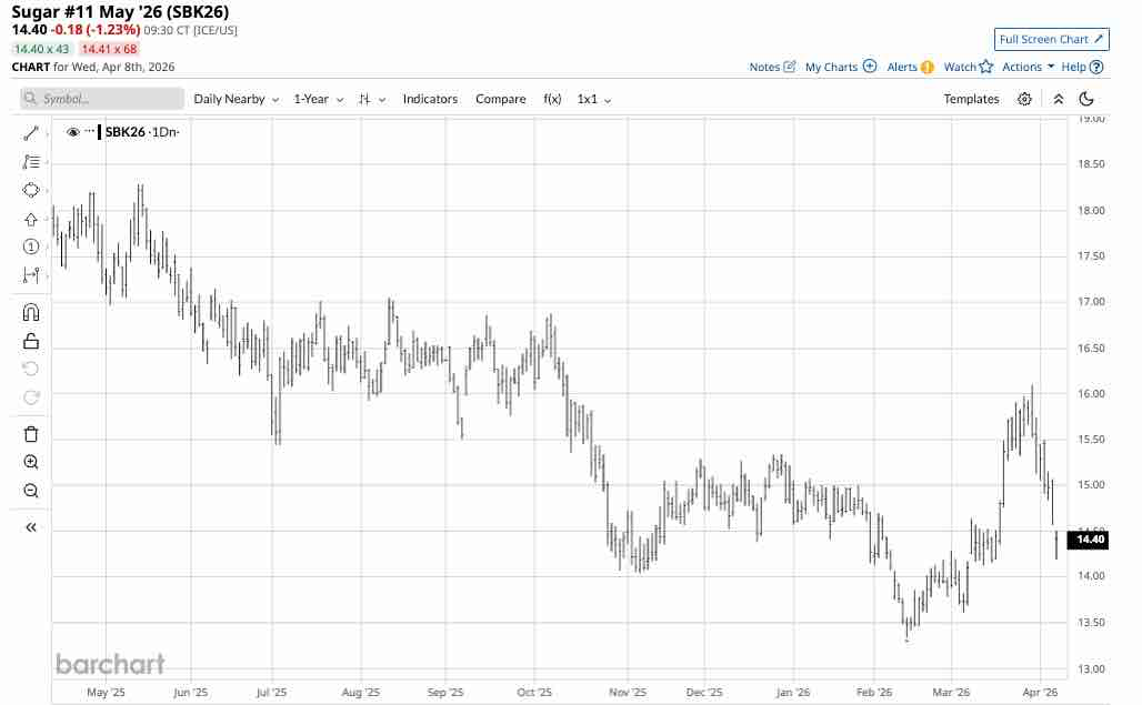 The monthly chart shows that world sugar futures rallied 20.7% from the February low to the most recent March high of 16.10 per pound. Rising oil and oil product prices have boosted Brazilian ethanol demand, in turn supporting higher sugar prices. Moreover, as I had mentioned in the late January 2026 Barchart article, “Commodity cyclicality suggests that sugar prices could be closer to a potential low than a high in 2026, making the risk-reward on a long position attractive.”