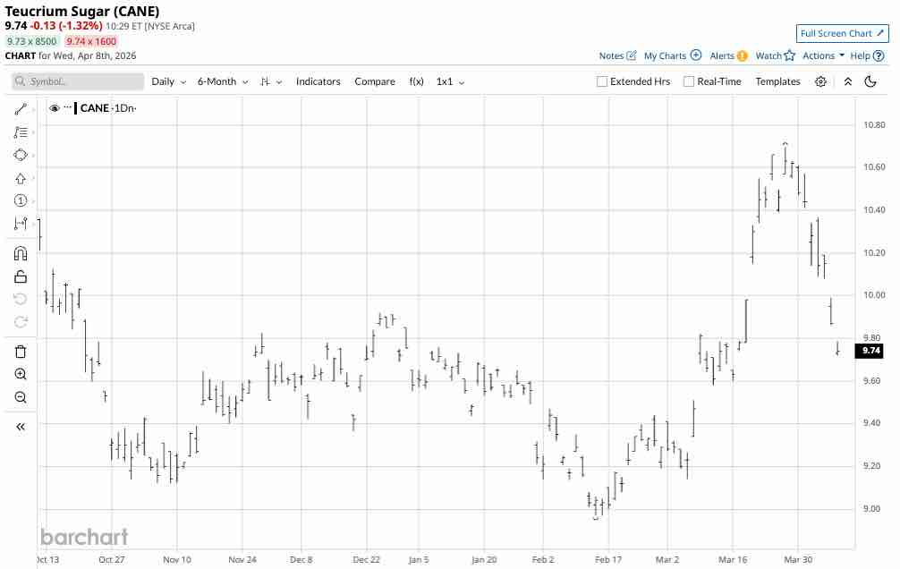 Nearby world sugar futures were trading at 14.96 per pound on January 22, while the Teucrium Sugar ETF (CANE) was trading at $9.66 per share. Sugar futures and the CANE ETF were lower on April 8 after reaching a new 2026 high on March 30.