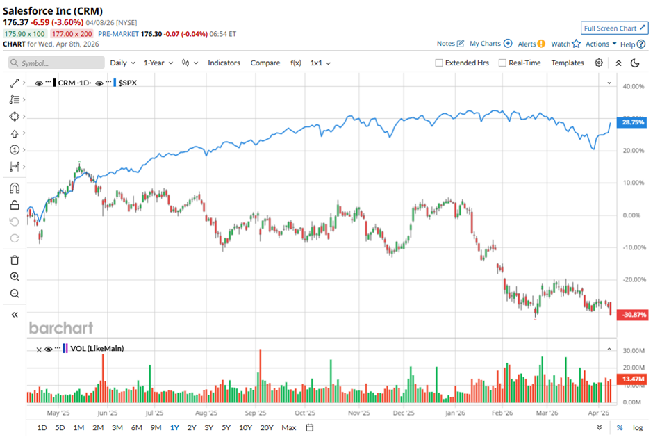 Shares of this software heavyweight have been under intense pressure as AI fears rattle sentiment. The stock has tumbled 36.74% over the past year and plunged another 36.68% in 2026, sharply underperforming the broader S&P 500 Index ($SPX), which surged 25% last year and is only marginally lower this year.