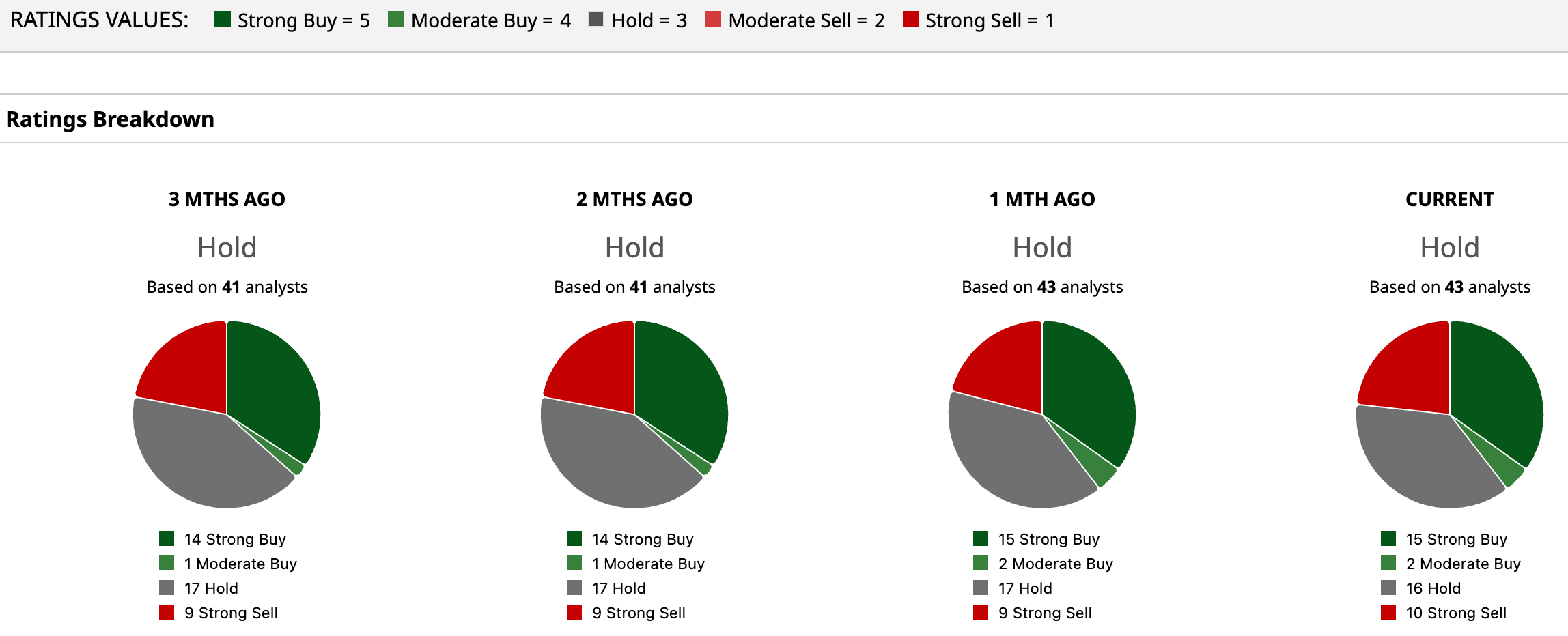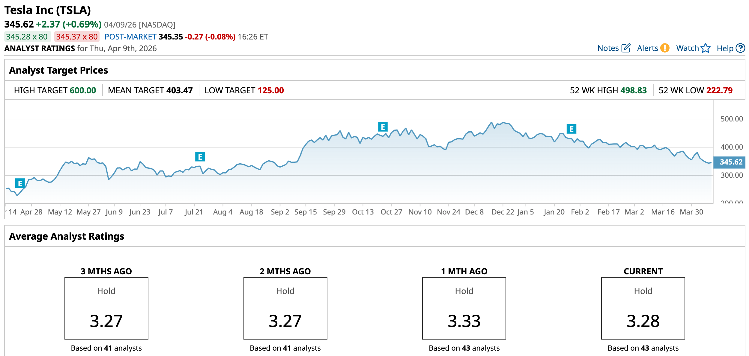 Based on 43 analyst estimates, Tesla stock has a consensus "Hold" rating. The stock has a mean price target of $403.47, reflecting about 16.74% upside from the current levels.
