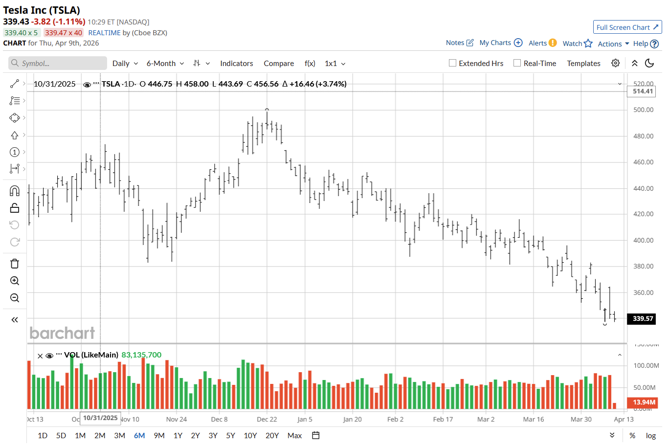 Tesla (TSLA) heads into its Apr. 22 earnings with an eerie silence. The stock has lost one-third of its value since hitting all-time highs in December last year. Elon Musk has been relatively subdued and hasn’t said anything controversial about the company. U.S. sales are weak but offset by strength in China and Europe. Inventories are rising. Yet none of this explains the consistent decline in stock price during the first quarter of the year. What gives?