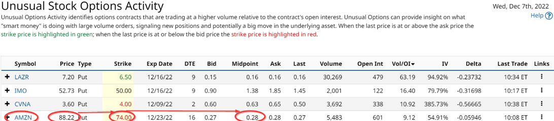 For example, the Barchart Unusual Stock Options Activity report on Dec. 7 shows that the Dec. 23 put options at a $74 strike price have been heavily shorted. The midprice received seems to be about 28 cents.