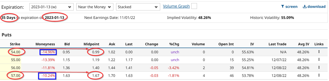 It shows that at the $57.00 strike price trade for $1.67 per contract. The $57 strike price implies the stock price, at $63.50 today, will fall over 10% to $57 in 35 days or before that. That also implies that an investor who shorts the $57.00 puts gets an immediate yield of 2.93% (i.e., $1.67 / $57.00 = 2.929%). This is also equal to an incredible annualized yield of 35%. In other words, that is a very high yield.