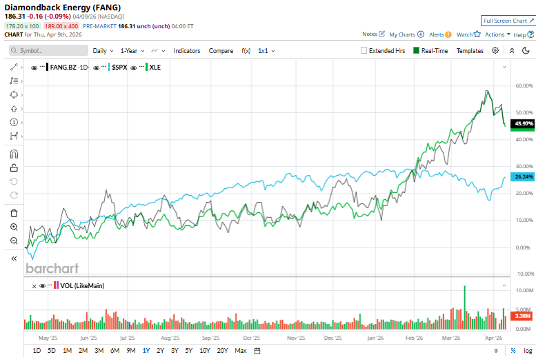 FANG stock has climbed 38.1% over the past 52 weeks, outperforming the S&P 500 Index’s ($SPX) 25.1% gains, but slightly trailing the State Street Energy Select Sector SPDR Fund’s (XLE) 39.2% gains over the same time frame.