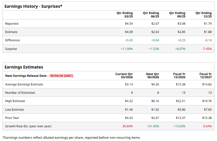 The leading independent oil and gas company is expected to announce its fiscal first-quarter earnings for 2026 after the market closes on Monday, May 4. Ahead of the event, analysts expect FANG to report a profit of $3.14 per share on a diluted basis, down 30.8% from $4.54 per share in the year-ago quarter. The company has surpassed Wall Street’s EPS estimates in three of its last four quarterly reports, while missing on another occasion.