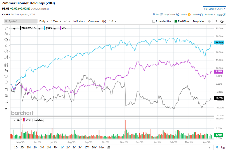 Shares of Zimmer Biomet have declined 10.1% over the past 52 weeks, lagging behind both the S&P 500 Index's ($SPX) 25.1% increase and the Health Care Select Sector SPDR Fund's (XLV) 7.6% rise over the same period.